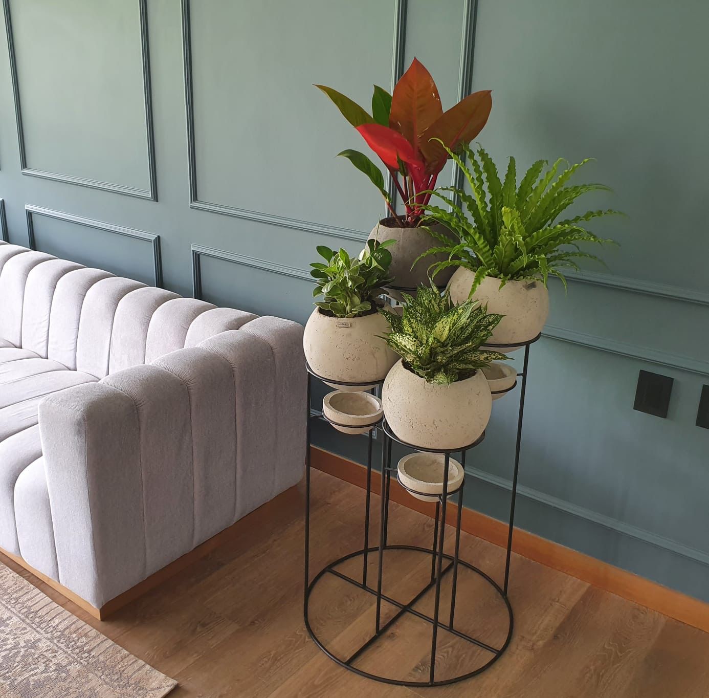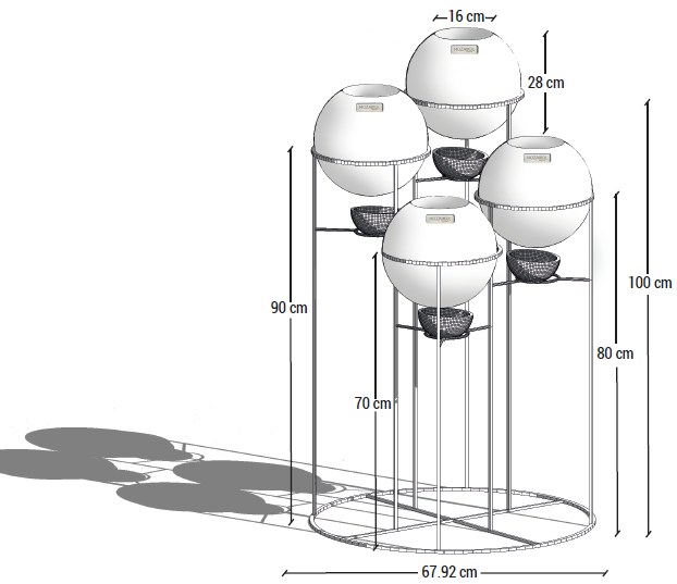 Macetas esféricas de 4 niveles. Peso: 14 kg. Diámetro: 26 cm. Accesorio en varilla metálica con pintura electrostática. *(Planta y Envío No incluidos, contáctanos a nuestro whatsapp para cotizar el envío)