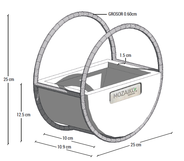 Maceta de media circunferencia. Peso: 500 gr. Diámetro: 25 cm. Profundidad: 10 cm- Altura: 12,5 cm. Accesorio en varilla metálica con pintura electrostática. *(Planta, Instalación y Envío No incluidos, contactanos a nuestro whatsapp para cotizar el envío)